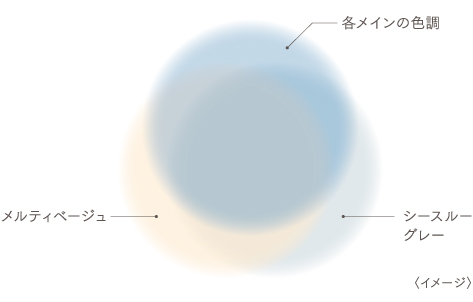 メラニンの赤みを抑え、透明感を与える「シースルーグレー」。まろやかで柔らかな印象を叶える「メルティベージュ」。2色をベースカラーに、各メインの色調との掛け合わせが織りなす三位一体の共鳴で叶える、肌映えの良さにこだわった色設計。その人らしい美しさを引き立てます。