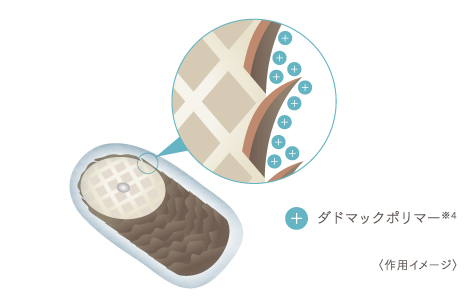 カチオン化密度の高いコンディショニング成分ダドマックポリマー※4配合。ダドマックポリマーは、毛髪への吸着性が高く耐洗髪性に優れた持続力の高いコンディショニング成分です。なめらかで、まとまりのある仕上がり感へ導きます。